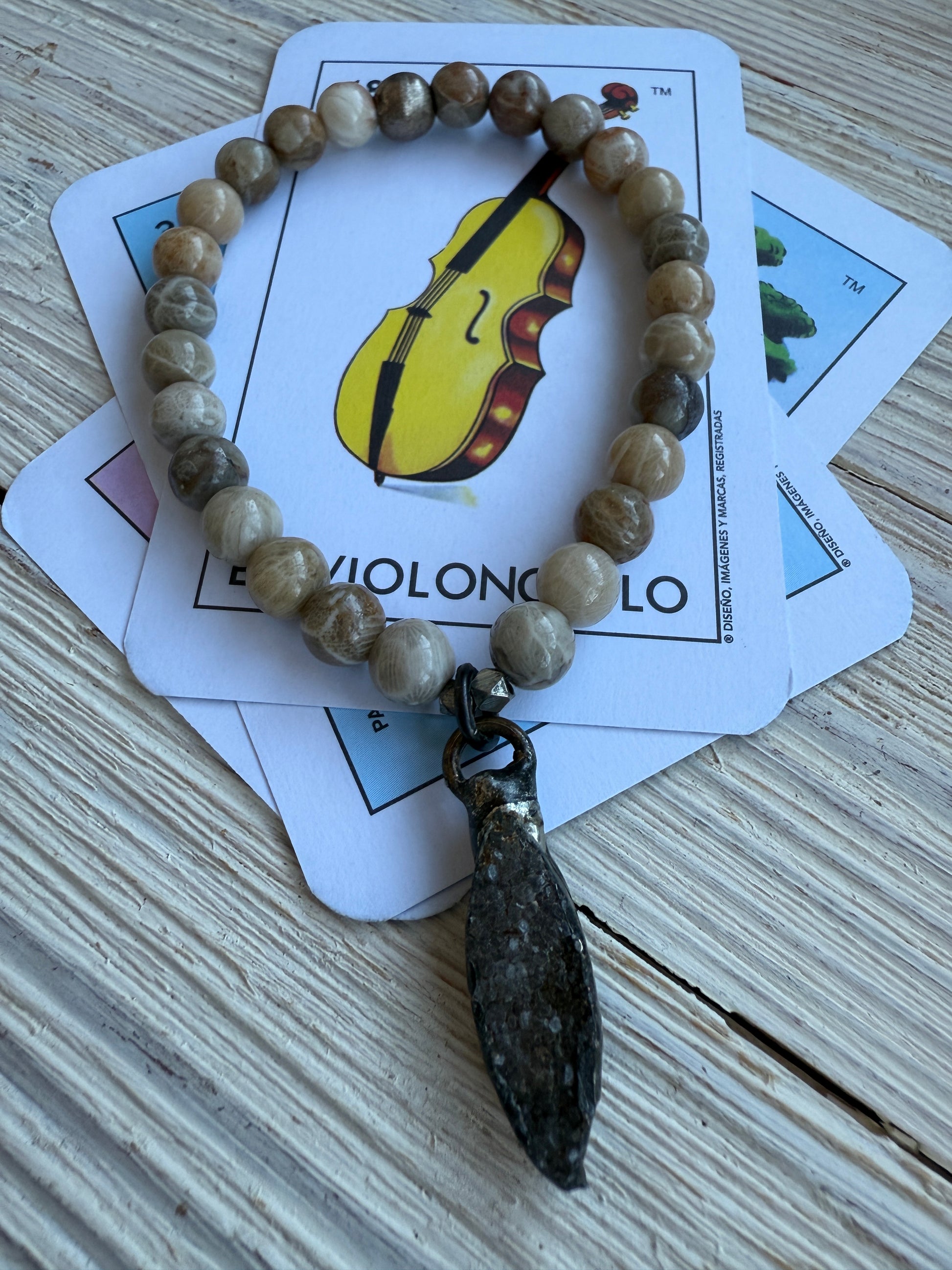 Smoky quartz druzie hangs from a stack bracelet of fossil coral beads 6.5-7”.