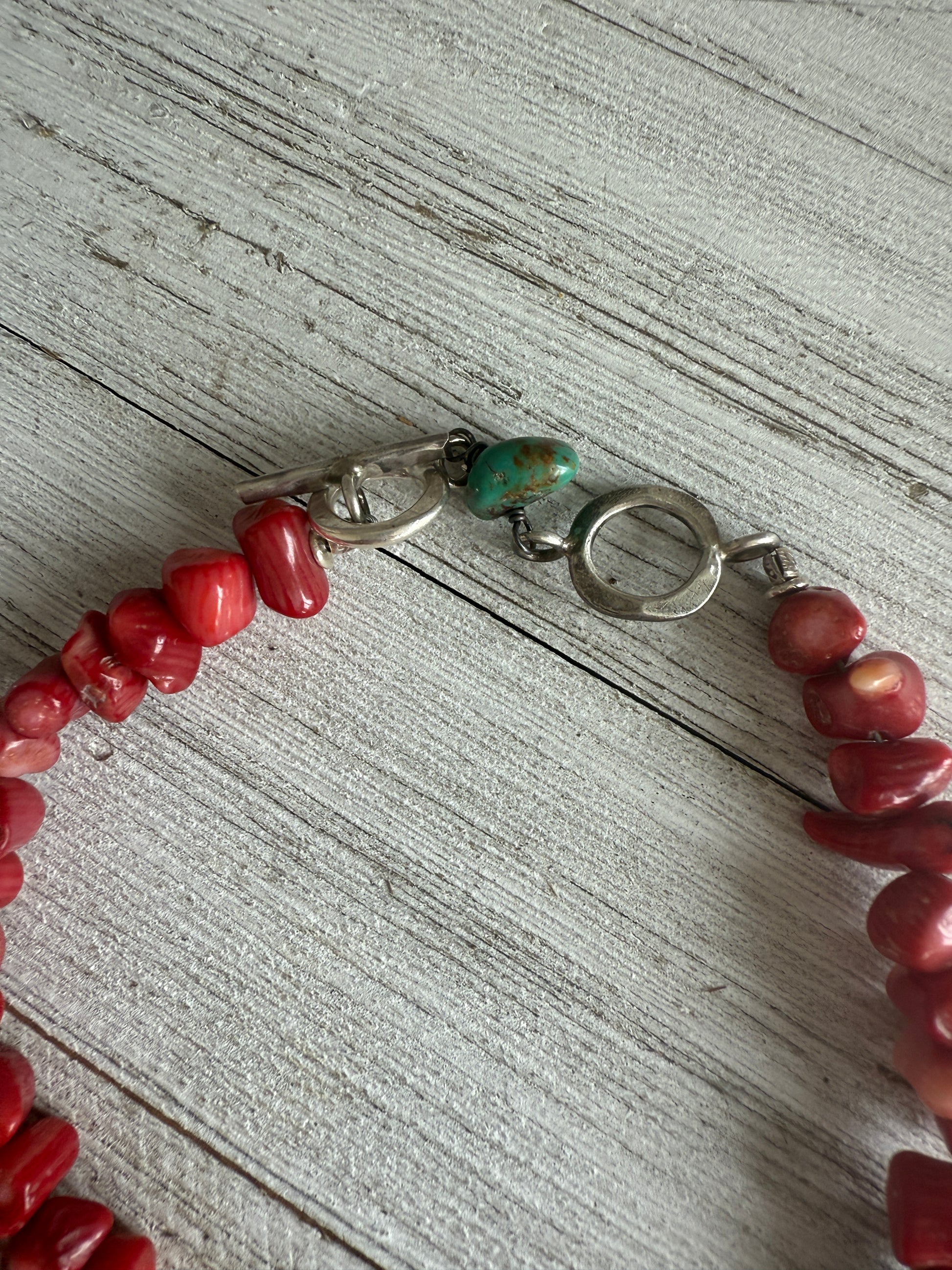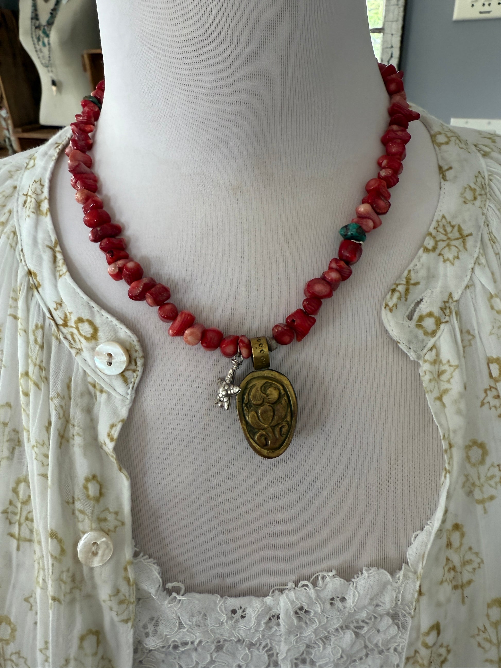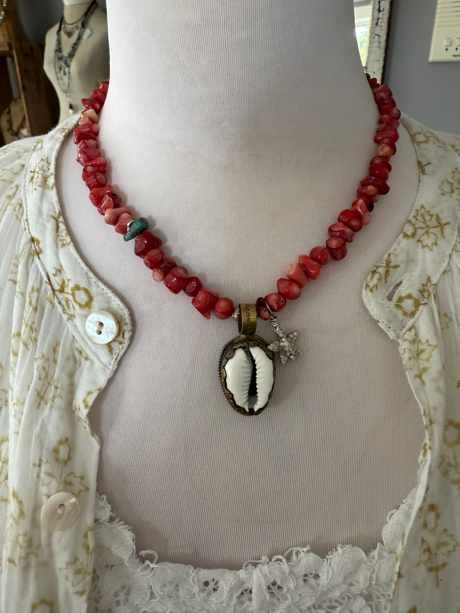 Tibetan cowrie shell pendant on coral necklace. 17.5-18.5”