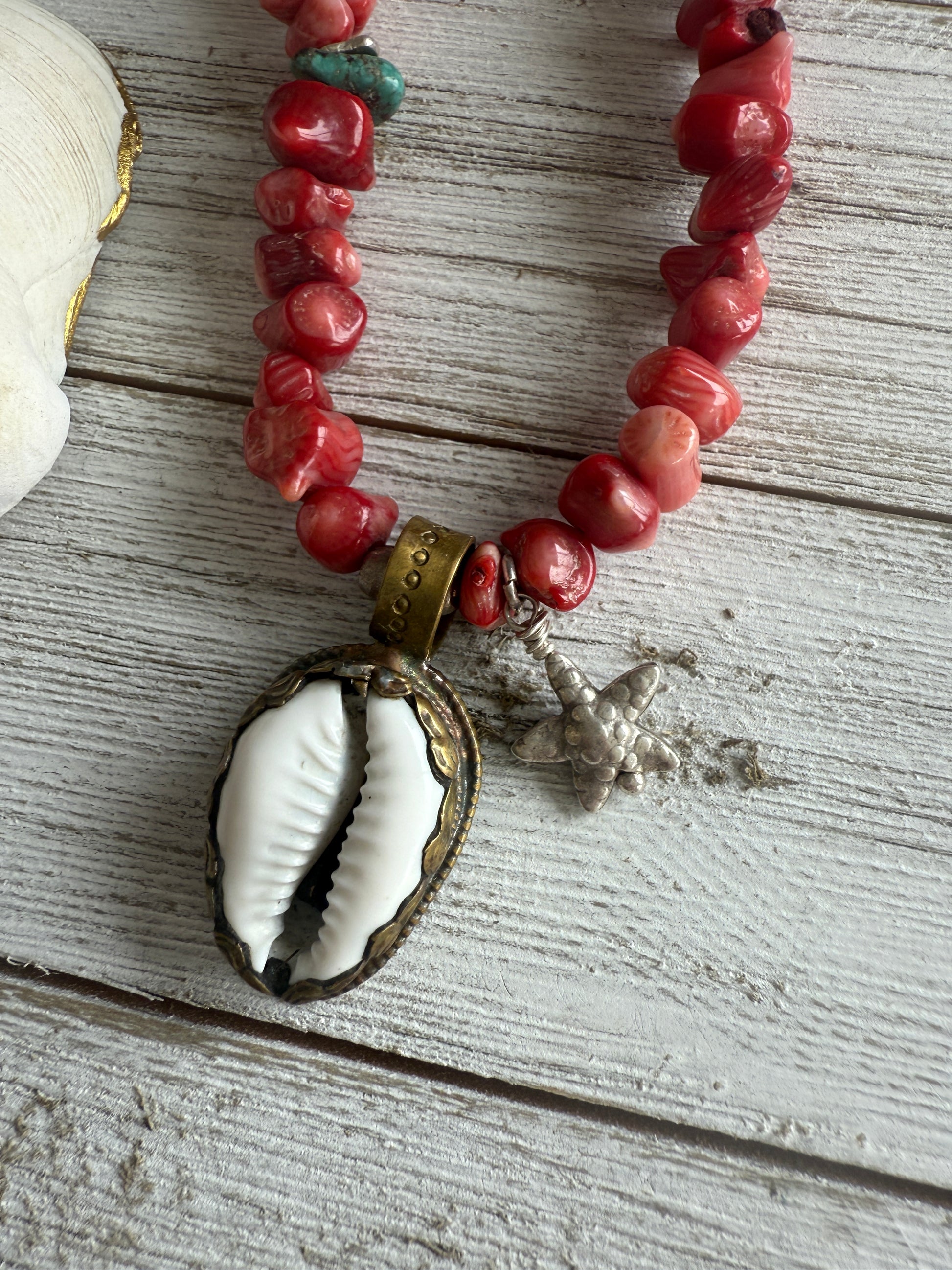 Tibetan cowrie shell pendant on stick coral with fine silver starfish and turquoise accent beads. Fine silver toggle with extender and fine silver spacers . 17.5-18.5” Cute worn solo or layered as shown.