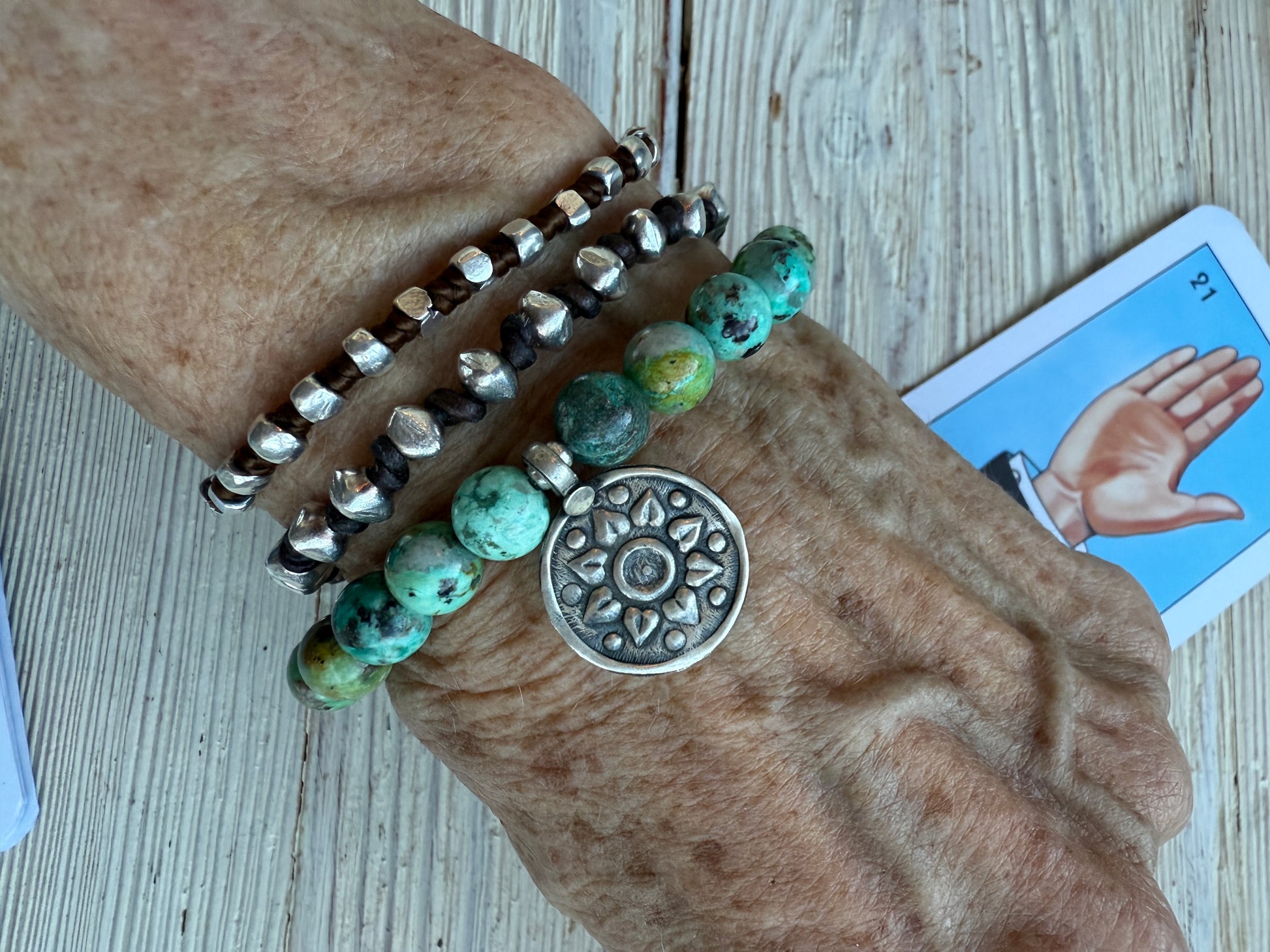 Turquoise beads with one vintage sterling bead from Nepal and a vintage Nepalese sterling charm. 6.5-7” stretch bracelet.