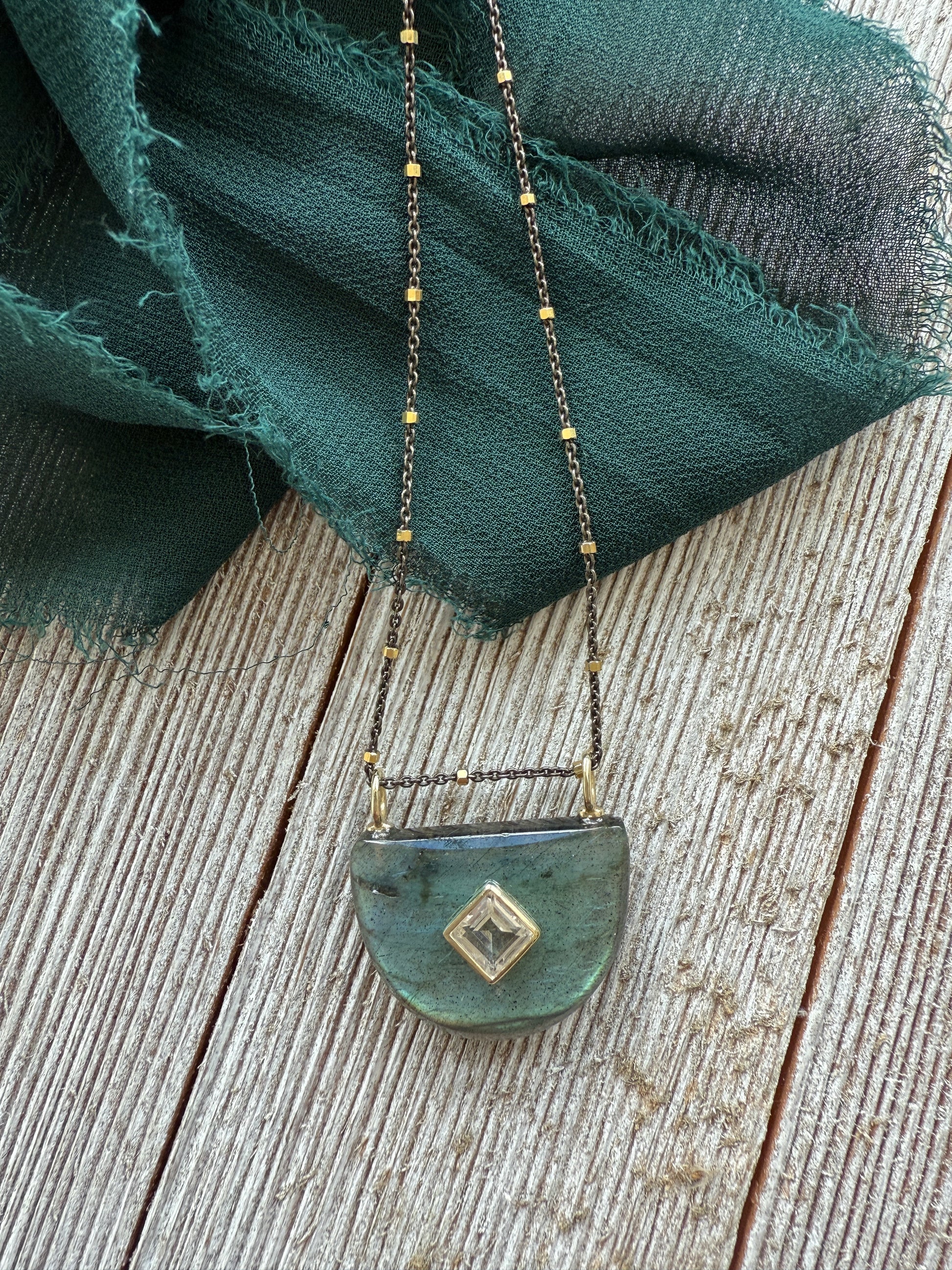 Labradorite half moon pendant with topaz inlay on rhodium sterling chain with vermeil cubes. 15.25-16.75”. One of a kind.