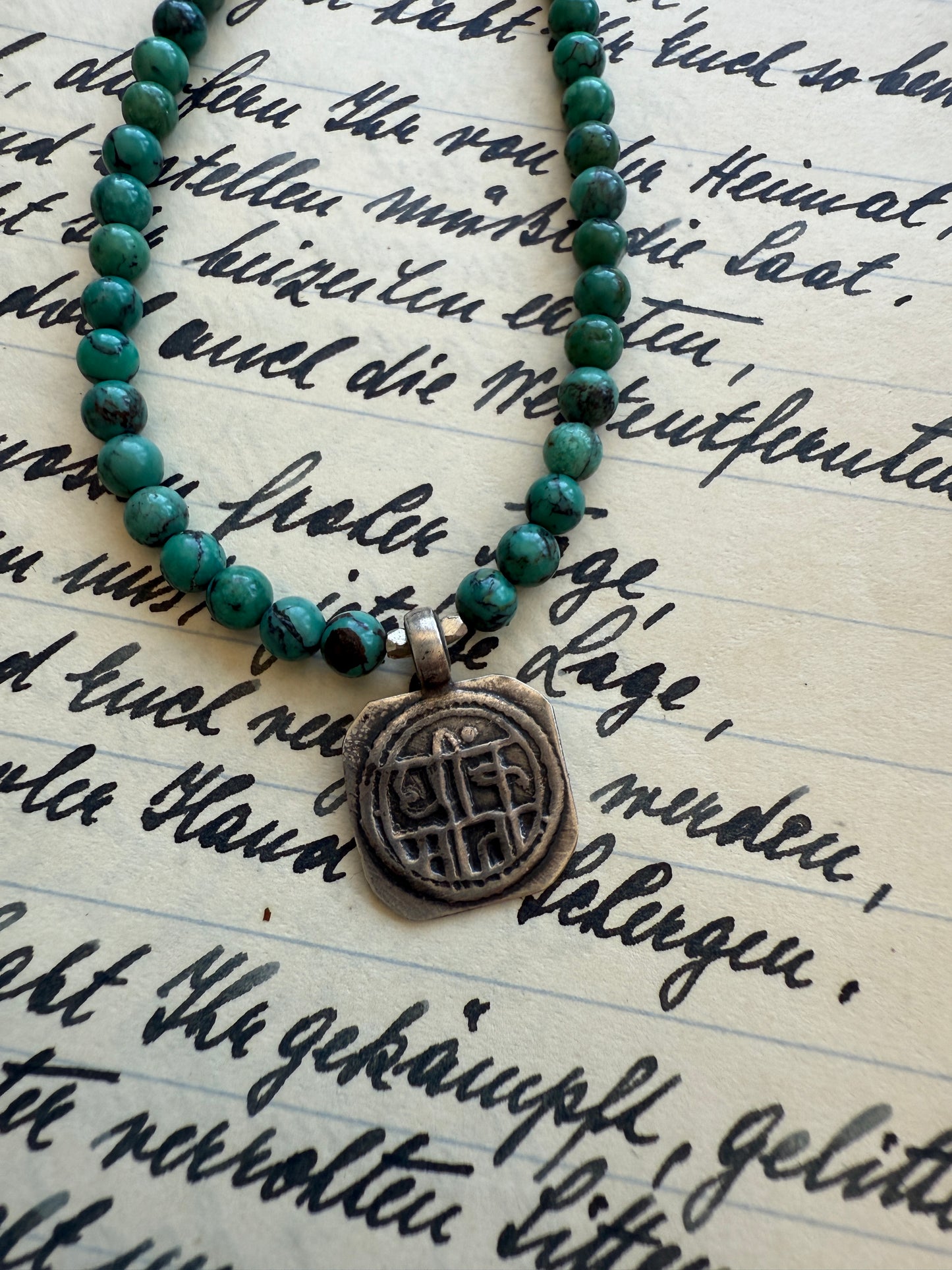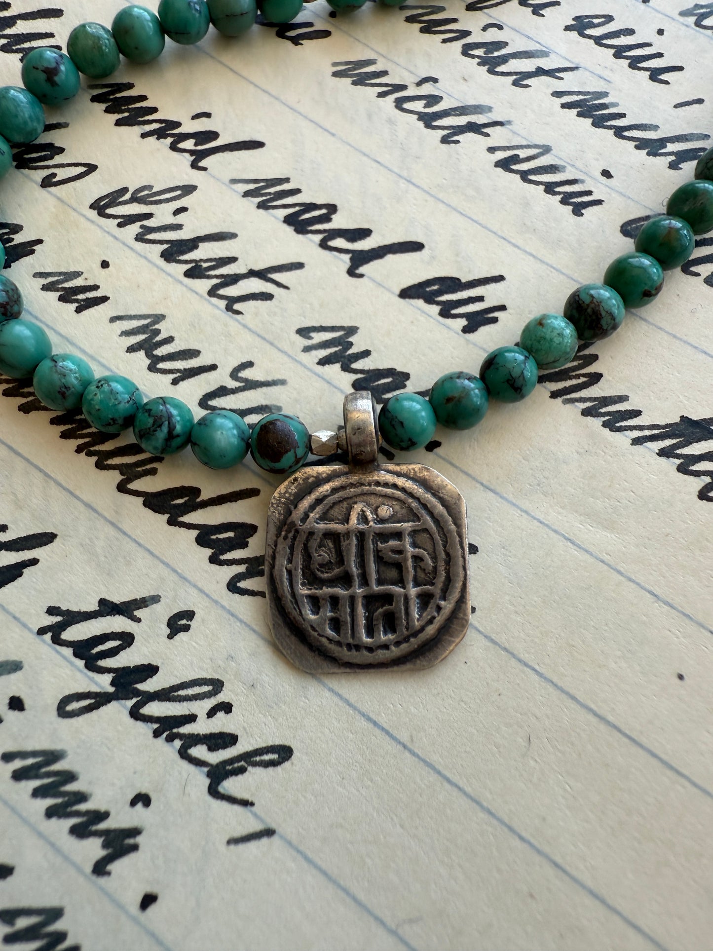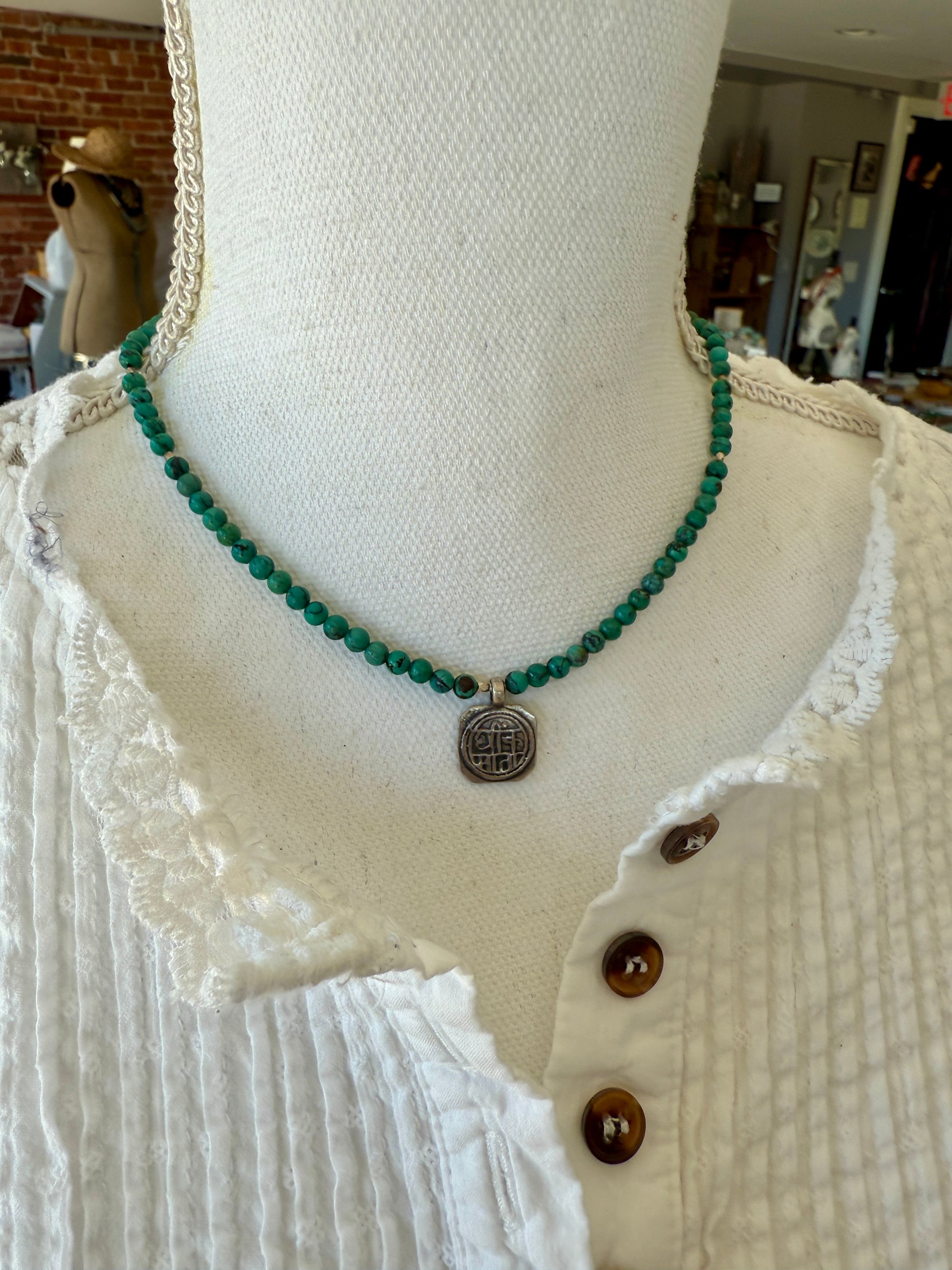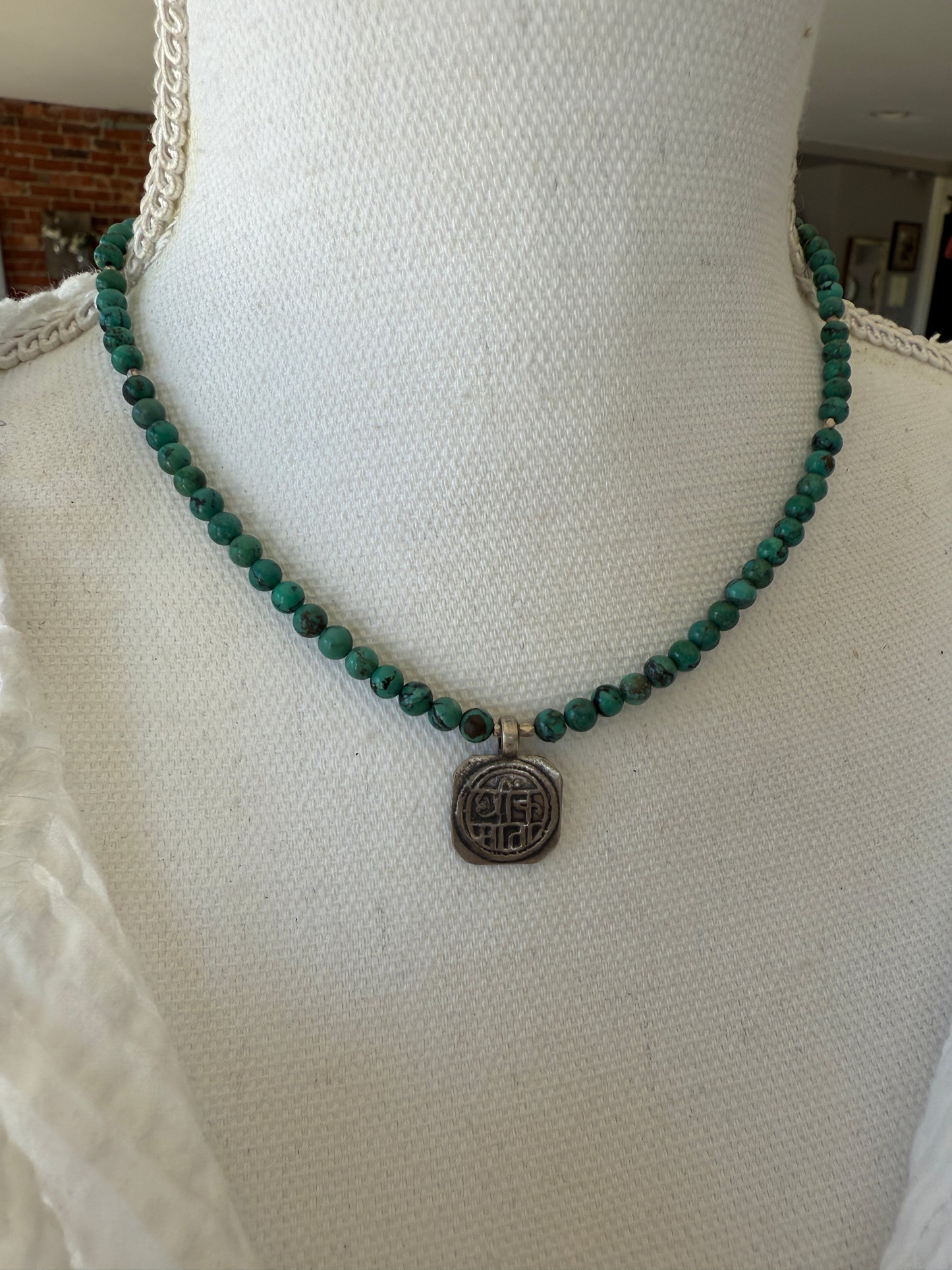Tibetan charm on turquoise necklace. 16” with a fine silver toggle clasp.
